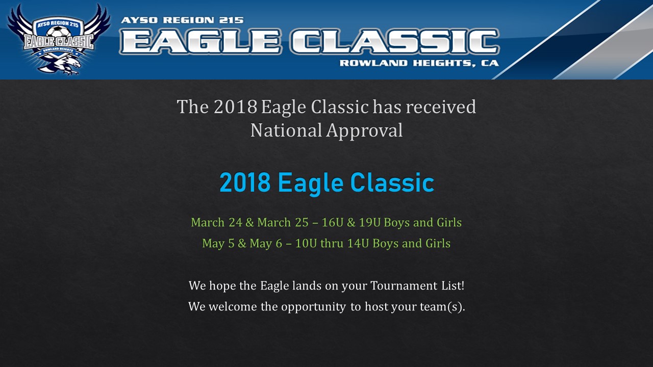 The purpose of the Eagle Classic Tournament is to provide the players, parents and coaches of teams interested a safe, fair, and fun venue to continue their soccer experience during the spring. Revenues from the Eagle Classic Tournament will implemented to provide equipment and other resources to the players and coaches of Region 215’s spring season.The purpose of the Eagle Classic Tournament is to provide the players, parents and coaches of teams interested a safe, fair, and fun venue to continue their soccer experience during the spring. Revenues from the Eagle Classic Tournament will implemented to provide equipment and other resources to the players and coaches of Region 215’s spring season.
