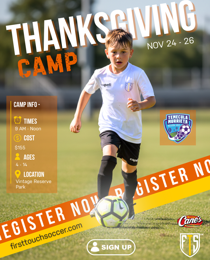AYSO 1463 is thrilled to announce that FIRST TOUCH SOCCER is coming to Murrieta to provide us with an amazing Thanksgiving Soccer Camp session for our youth soccer players. FTS instructors include highly trained soccer coaches who'll provide your children with incredible soccer knowledge!