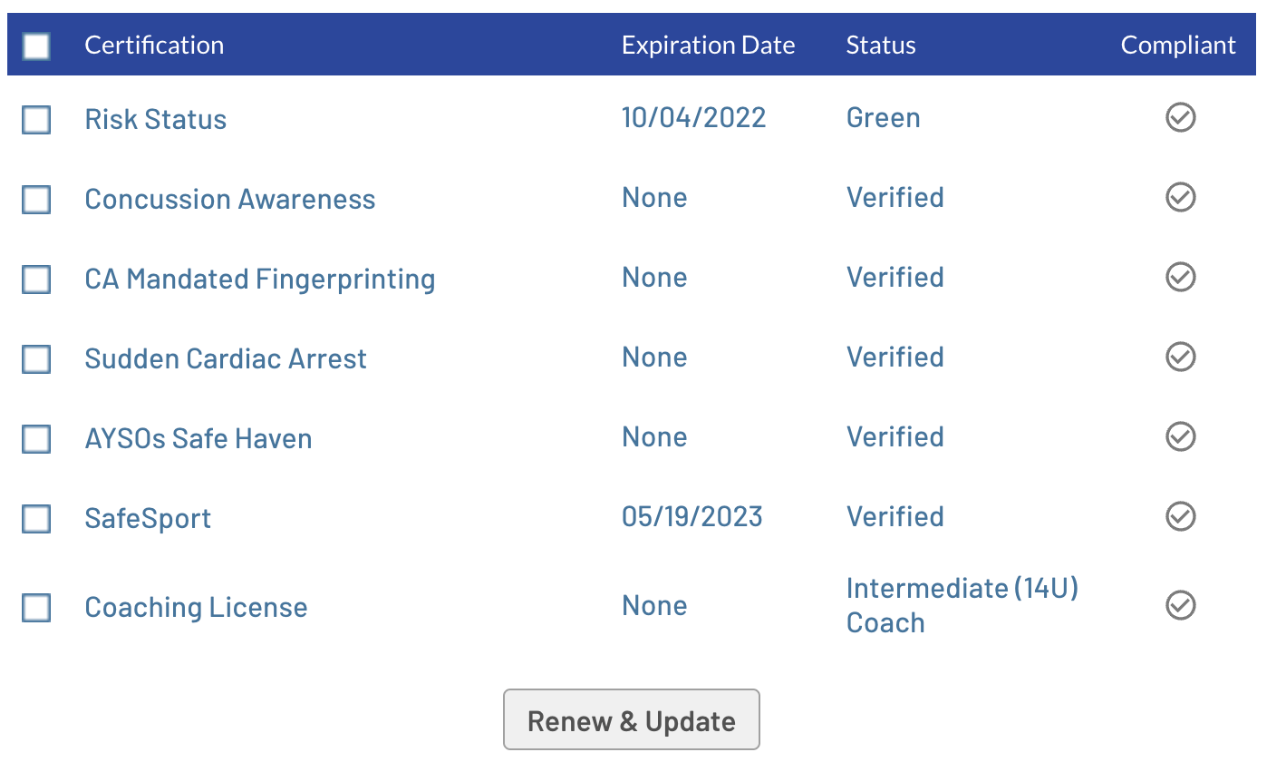 Coach certification is a one-time requirement that fulfills the training requirement for that age division and all younger divisions. In addition, you’ll need to complete any required safety and background courses. You can view these in your volunteer profile. Your account will show the specific requirements for you. To be eligible, your profile must show as “compliant” in all listed steps.