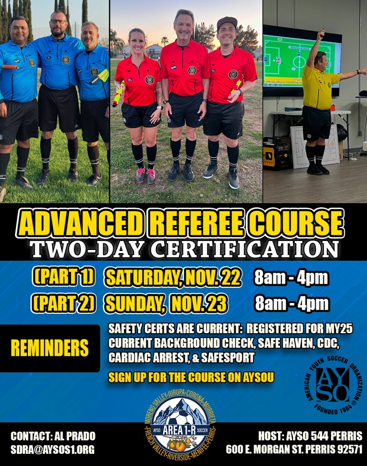 The purpose of this course is to train Intermediate Referees in all aspects of refereeing to develop skills that will allow the referee to officiate most AYSO soccer matches under the AYSO (IFAB) Laws and AYSO National Rules and Regulations.